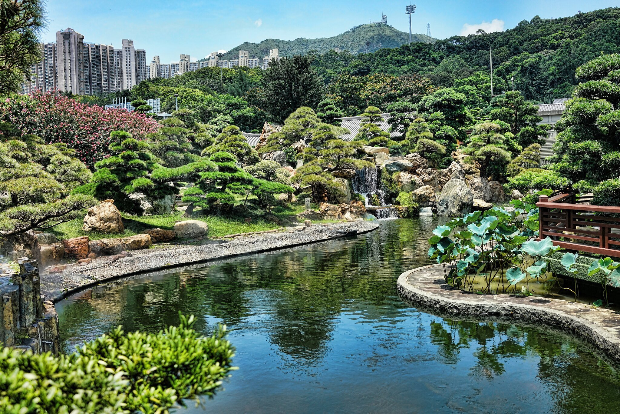 Water features are prominent and beautifully integrated (ponds, cascades, red bridges).
