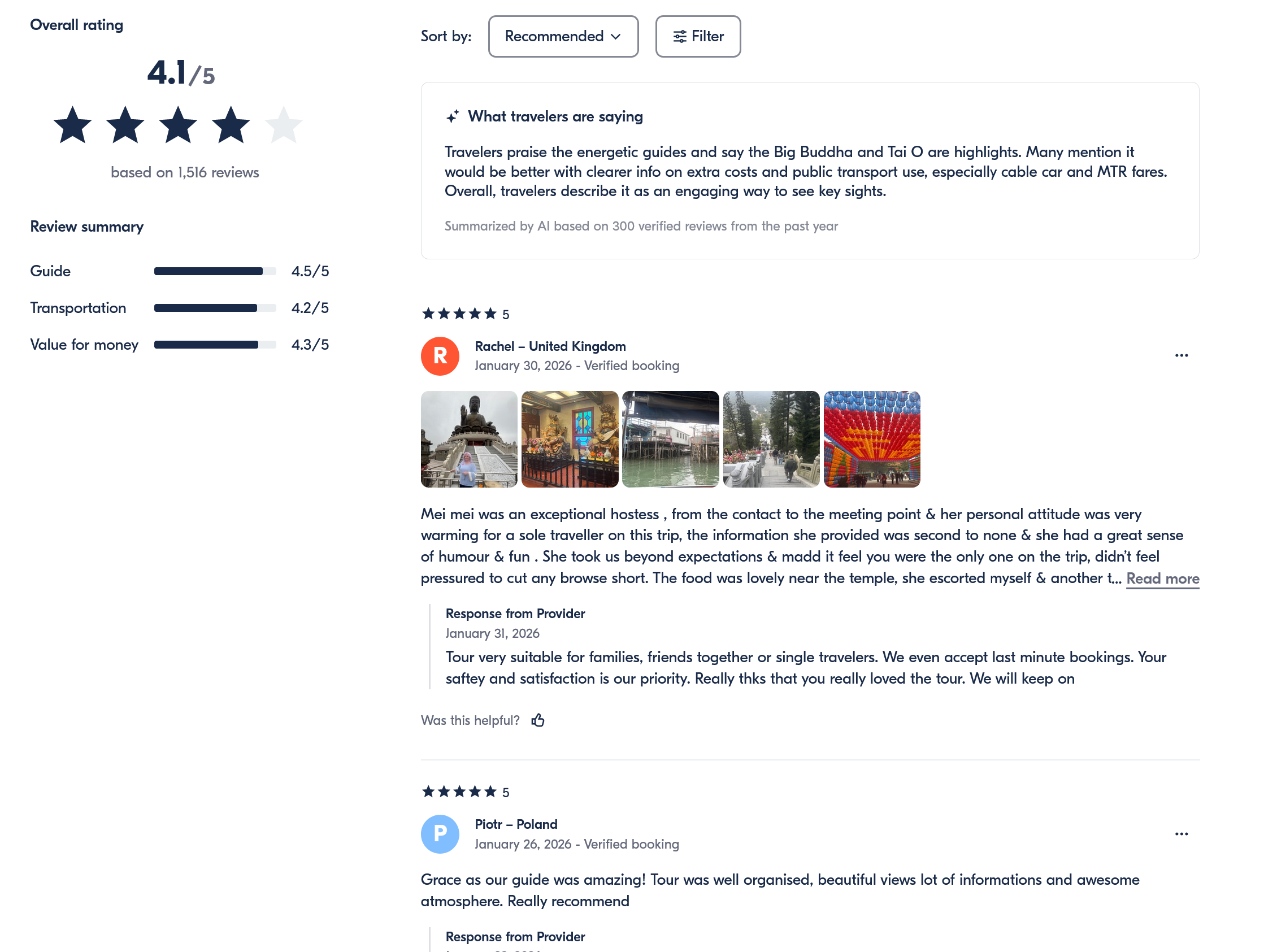 Prioritize recent reviews, especially negative ones (1 - 2 stars). Look for recurring complaints like poor organization, misleading itineraries, or rude guides - these often highlight systemic issues, if a company is getting regular terrible reviews it should set of the alarm bells