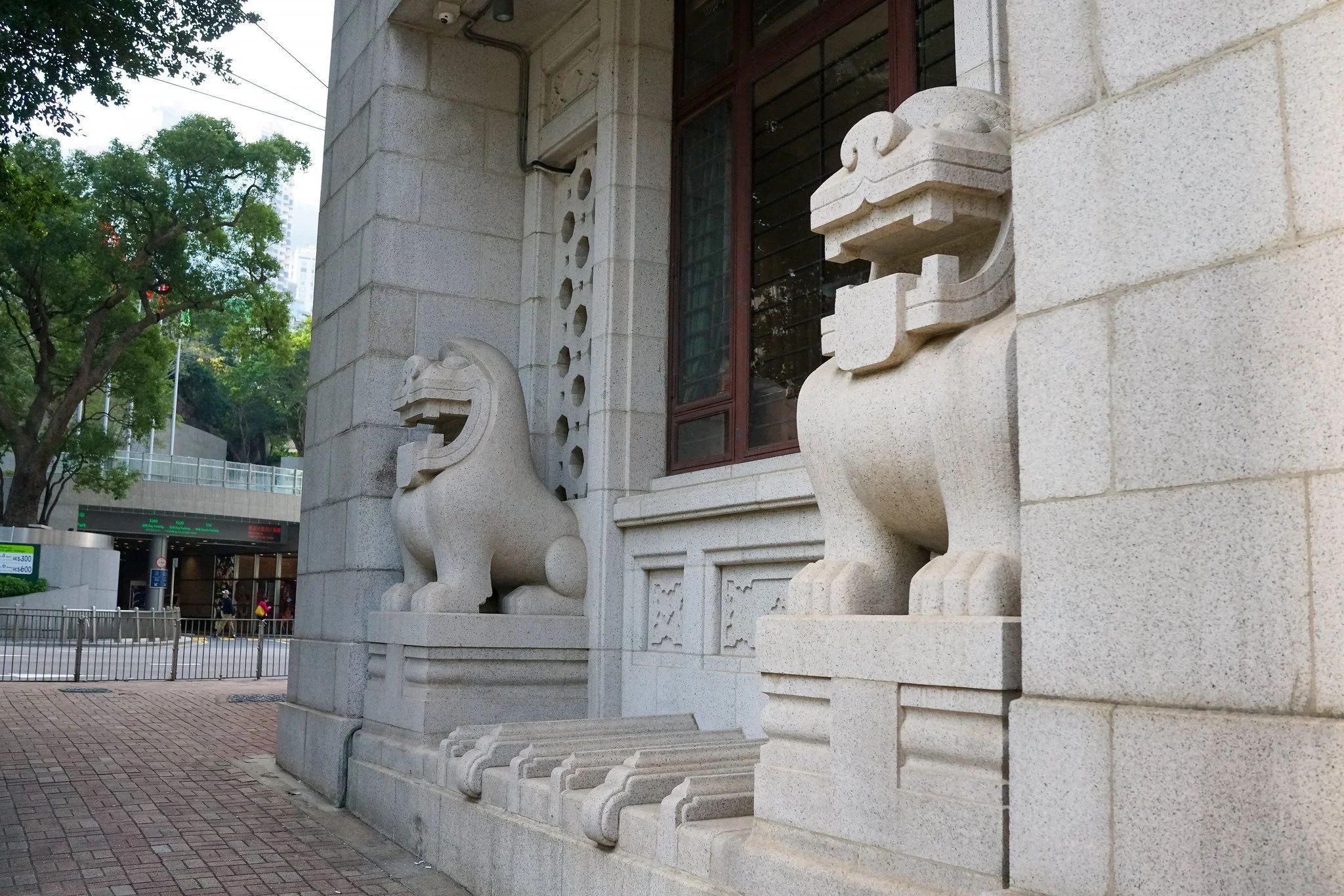 The old BOC granite foo dogs are quieter symbols of the building's Art Deco era and its role as the pre-1990 Chinese banking presence in colonial Hong Kong.
