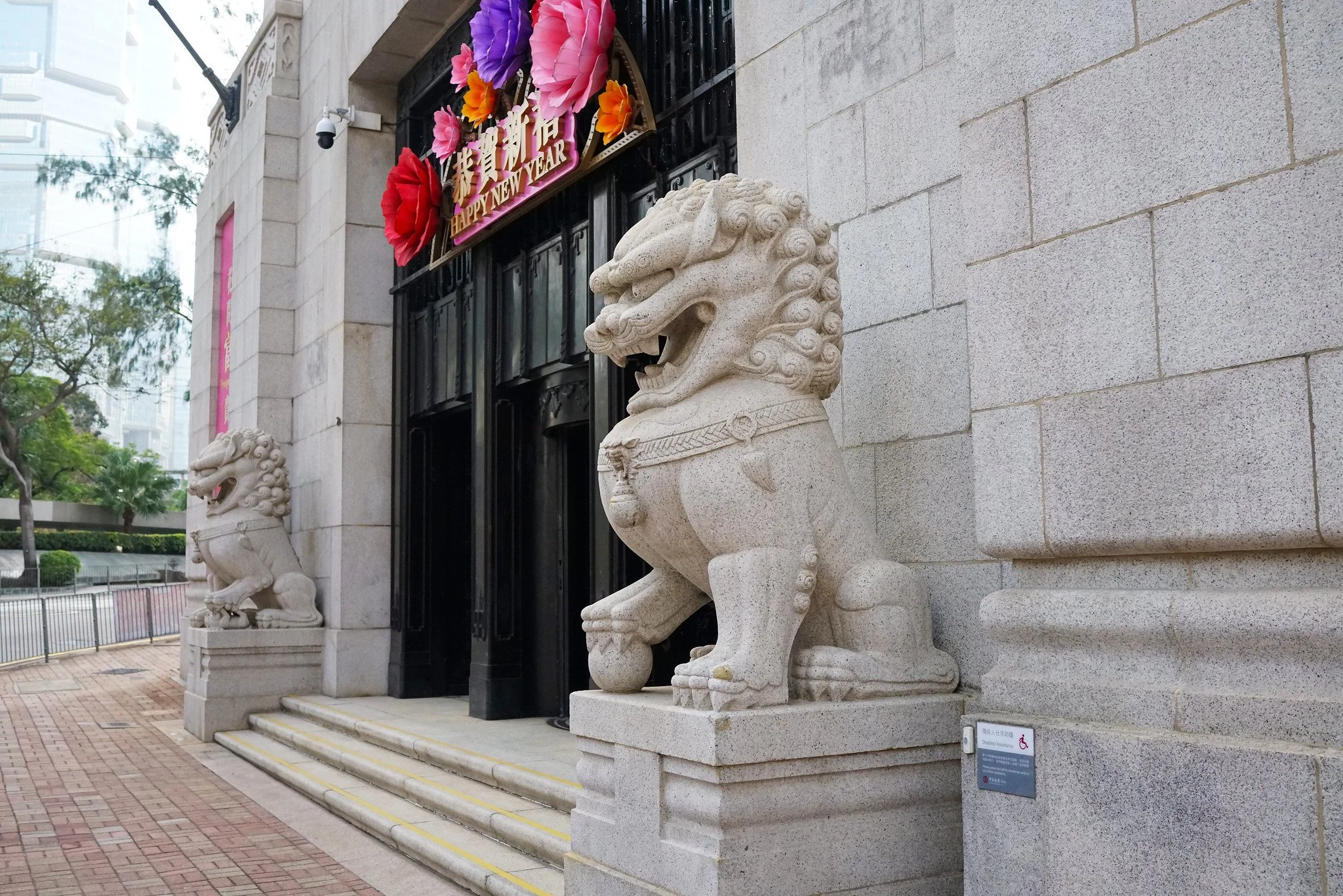 Old Bank of China headquarters (next door at 2A Des Voeux Road Central): This 1951 granite Art Deco building (the former main HQ before the 1990 tower) has traditional Chinese granite foo dogs (stone guardian lions) at its main entrance on Des Voeux Road. There is a classic male-female pair: the male (left, usually) plays with an embroidered ball, the female protects a cub. These are proper shishi / foo dogs in the traditional Chinese style - muscular, ornate, and unmistakably Eastern.