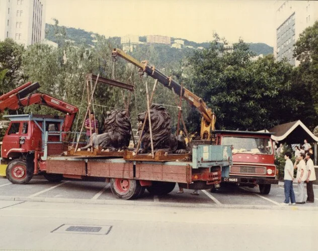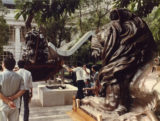The lions were moved to Statue Square (just across the road from the old HSBC headquarters) in June 1982 as the 1935 building was demolished to make way for the new Norman Foster-designed headquarters. They remained there for about three years (watching over the construction site) until their ceremonial return on 1 June 1985.