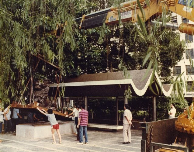A photograph of one lion (often identified as Stephen) being placed onto a plinth in Statue Square, dated around 4 June 1982.