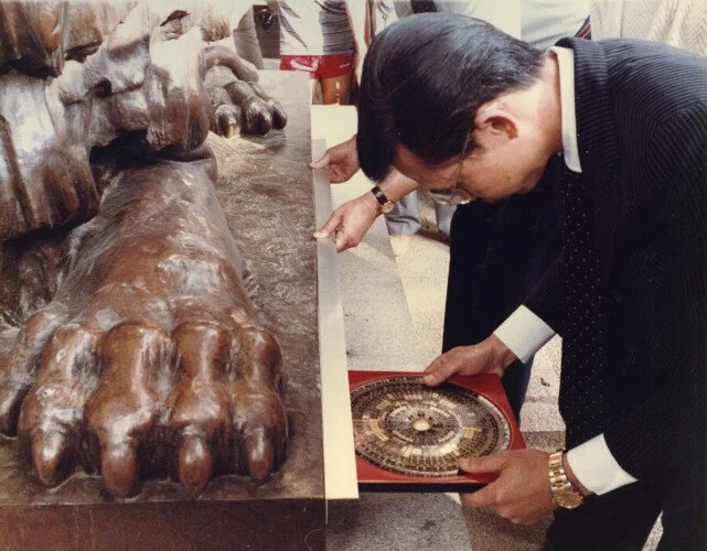 The reinstallation in the new building was equally deliberate. On 1 June 1985, under the careful supervision of the feng shui master, Stephen and Stitt were lifted simultaneously by two cranes - to avoid favouring one lion over the other - and lowered precisely into their final positions. A week later, HSBC Chairman Sir Michael Sandberg led an official welcome ceremony for the lions’ return. This level of attention reflected how seriously the bank treated the need to maintain the lions’ powerful feng shui role in the new structure.