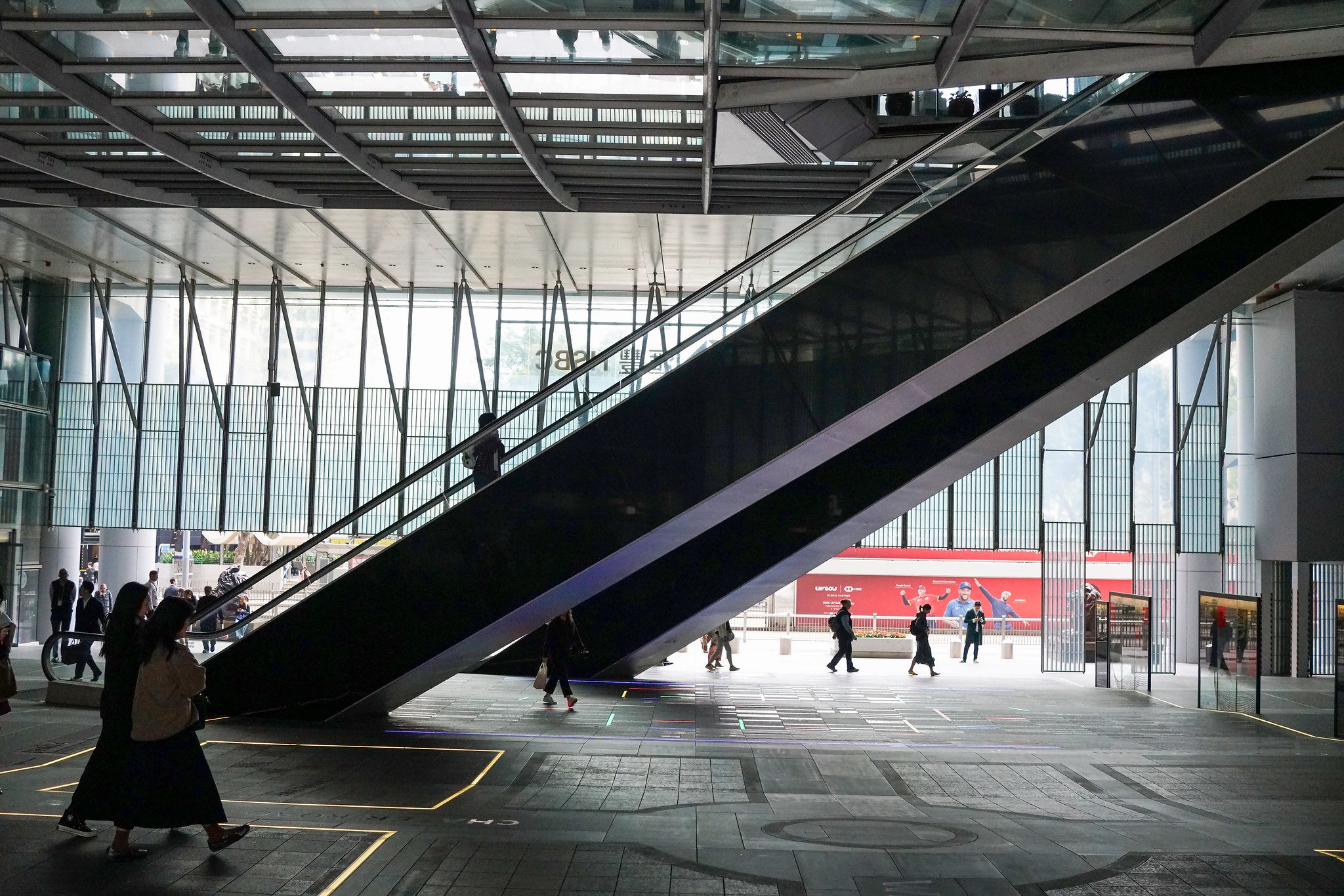 The escalators leading from the ground floor (see image above) into the atrium are deliberately angled (about 30 degrees off the main entrance axis). In feng shui belief, negative energy or evil spirits (sha qi) travel in straight lines. By offsetting the escalators, the design prevents these harmful energies from entering the building directly. This adjustment was a specific recommendation from the geomancers involved in the project. The open plaza itself also helps by allowing positive wind and qi to circulate freely, acting as a welcoming space for good energy.