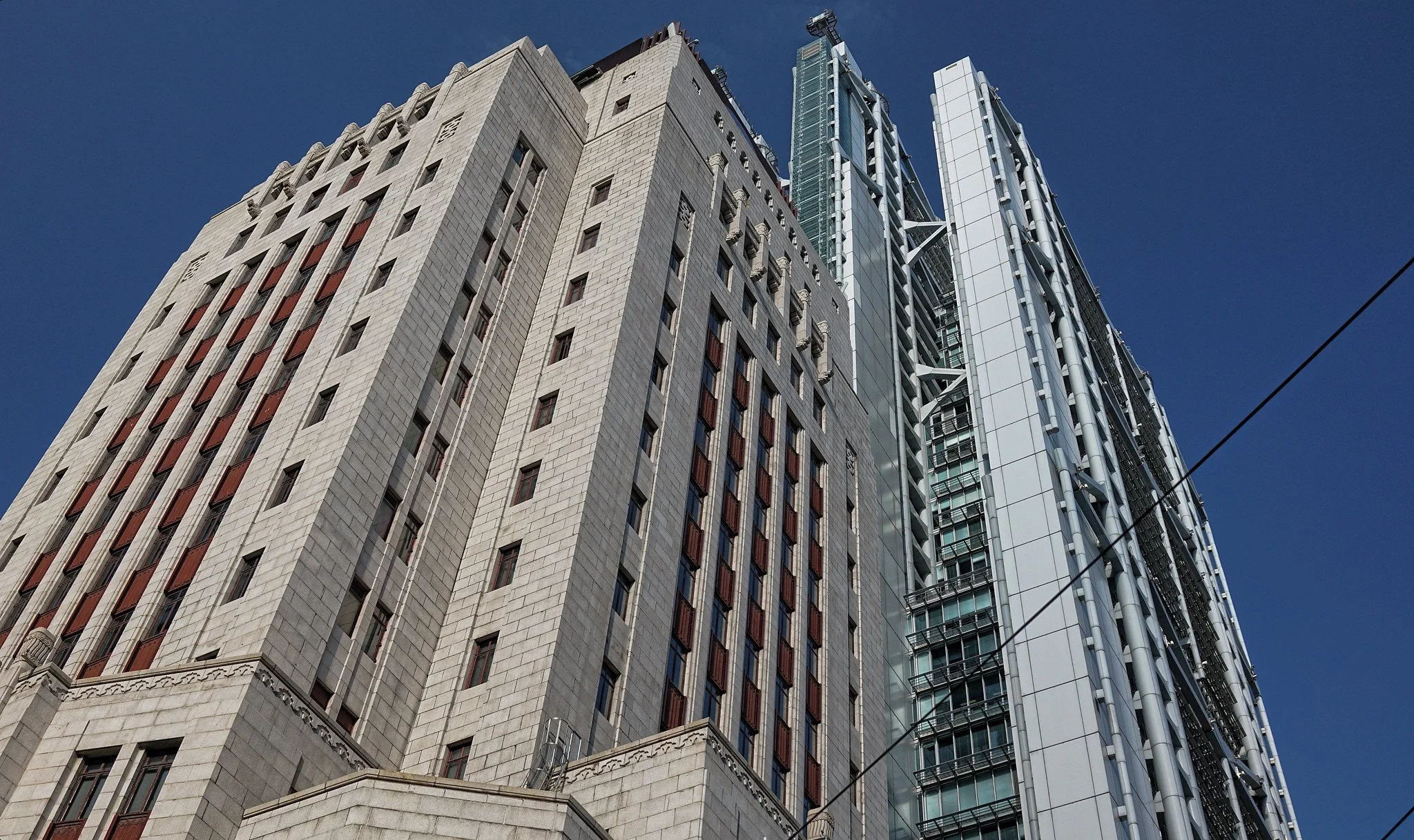 The Bank of China next door to HSBC Headquarters is actually the Old Bank of China Building (舊中銀大廈), the handsome Art Deco | granite-clad tower at the corner of Des Voeux Road Central and Queen's Road Central, right across from HSBC and adjacent to the Cheung Kong Centre. (Note: This is the original 1950s headquarters building, not the famous sharp-angled Bank of China Tower by I.M. Pei at 1 Garden Road, which is a bit further up and doesn't have entrance foo dogs.)