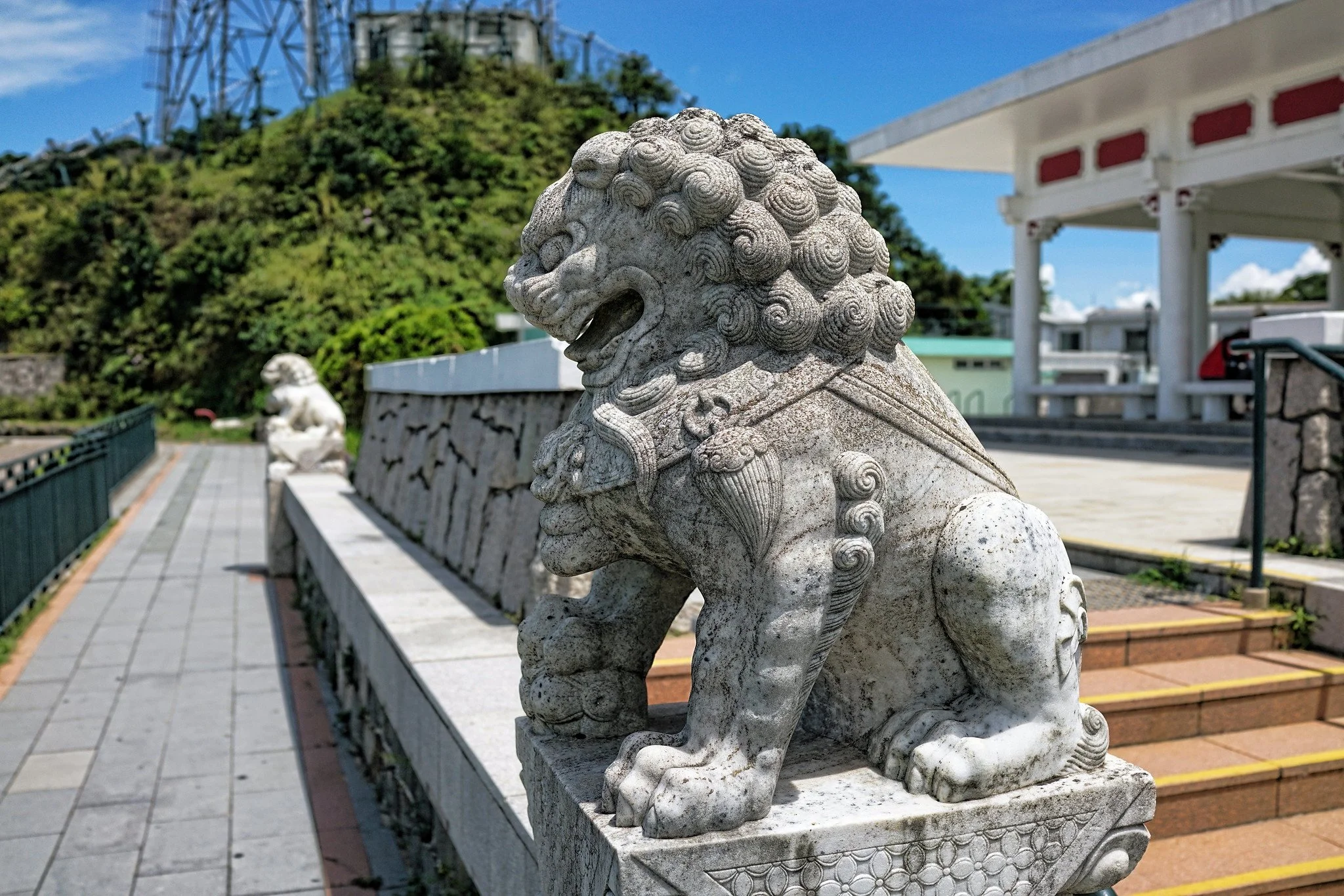 The Lions Pavilion's guardian lions, they are made of stone - likely a durable variety like granite or a similar hard decorative stone, which is the traditional material for outdoor Chinese shishi (stone lions). These aren't bronze like HSBC's Stephen and Stitt; they're classic carved stone sculptures, often in a light grayish-white or beige tone that shows wear and polishing clearly.