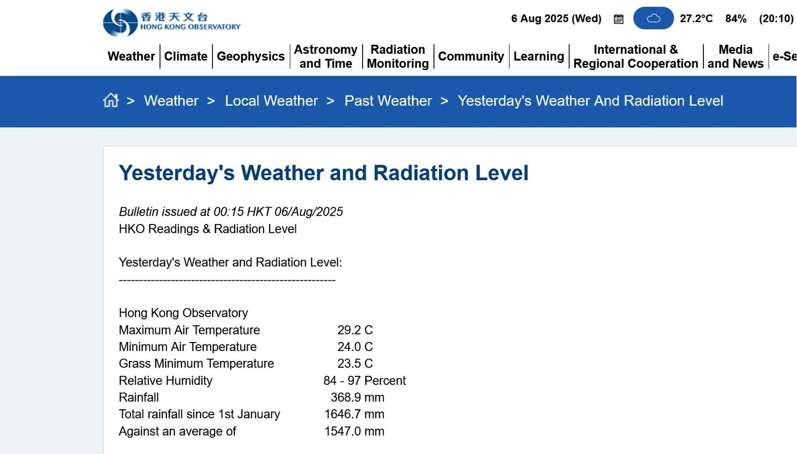 I should also point out that Hong Kong is hilly and next to the ocean so weather can vary dramatically from district to district when it comes to temperature and rainfall and in the summer is it quite cool at night.