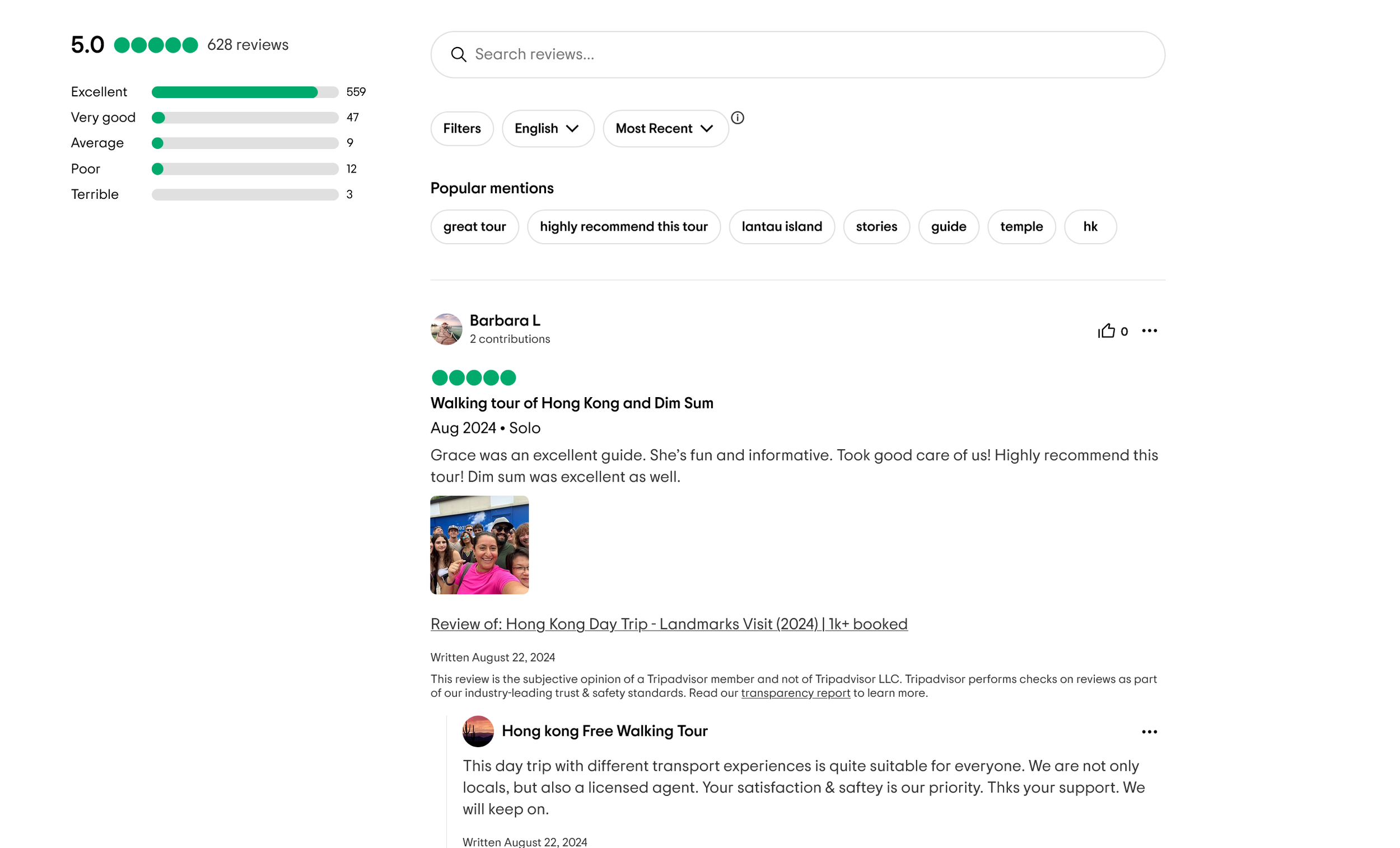 to figure out how a mediocre (at best) Tour Company can obtain over 300 Tripadvisor Reviews, virtually all glowing 5 star reviews in 2024 (even the best of the best tour companies in Hong Kong average 5 - 10 a month at most) and a lot of the reviews using the same words over and over - BRILLIANT | AMAZING | WONDERFUL | EXCEPTIONAL | FANTASTIC