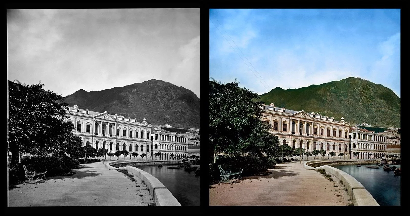 Our oldest son Jordan who lives in London, UK has done a bit of work for HSBC Archives department and colourised some old black and white images of the early HSBC buildings on the same site (see images below) and yes, that is Victoria Peak in the background! and that what the original harbour waterfront. where the water is in the image, well that is Statue Square