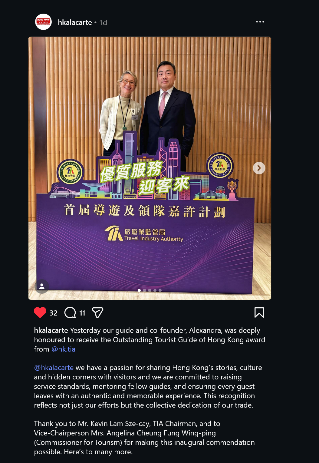 To Alexandra: congratulations ….Your recognition reflects not only your personal excellence but also the collective dedication of all the hardworking guides who help visitors fall in love with Hong Kong every day. Thank you for inspiring the rest of us and for raising the bar in such a positive way. Here’s to many more years of creating magical, authentic experiences together — and to the continued strength of our wonderful community of Hong Kong tour guides who prove, time and again, that collaboration and mutual respect make our industry stronger.