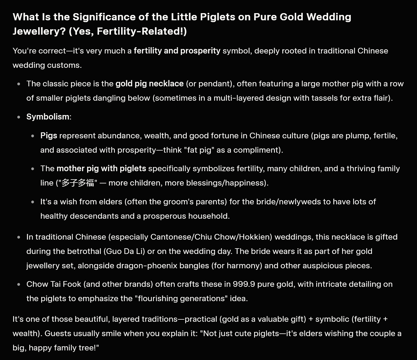 Please refer to the image above, quite astonishing how they can take a momma pig anf her piglets and make it into high end wedding jewellery (24k pure gold) even rappers would not wear such large chunks of jewellery, in fact these necklaces may only be worn once before being tucked away in the safe with daily prayers to ask for a rise in the price of gold!